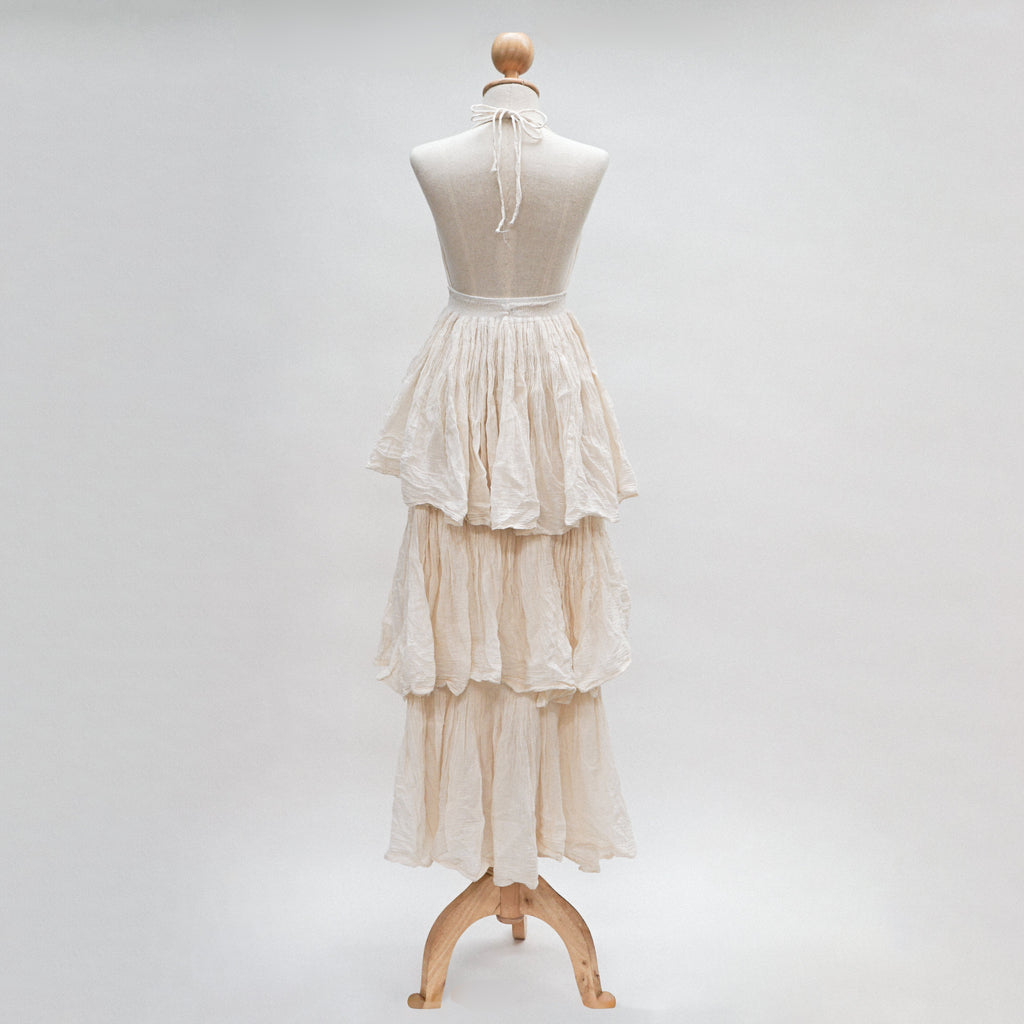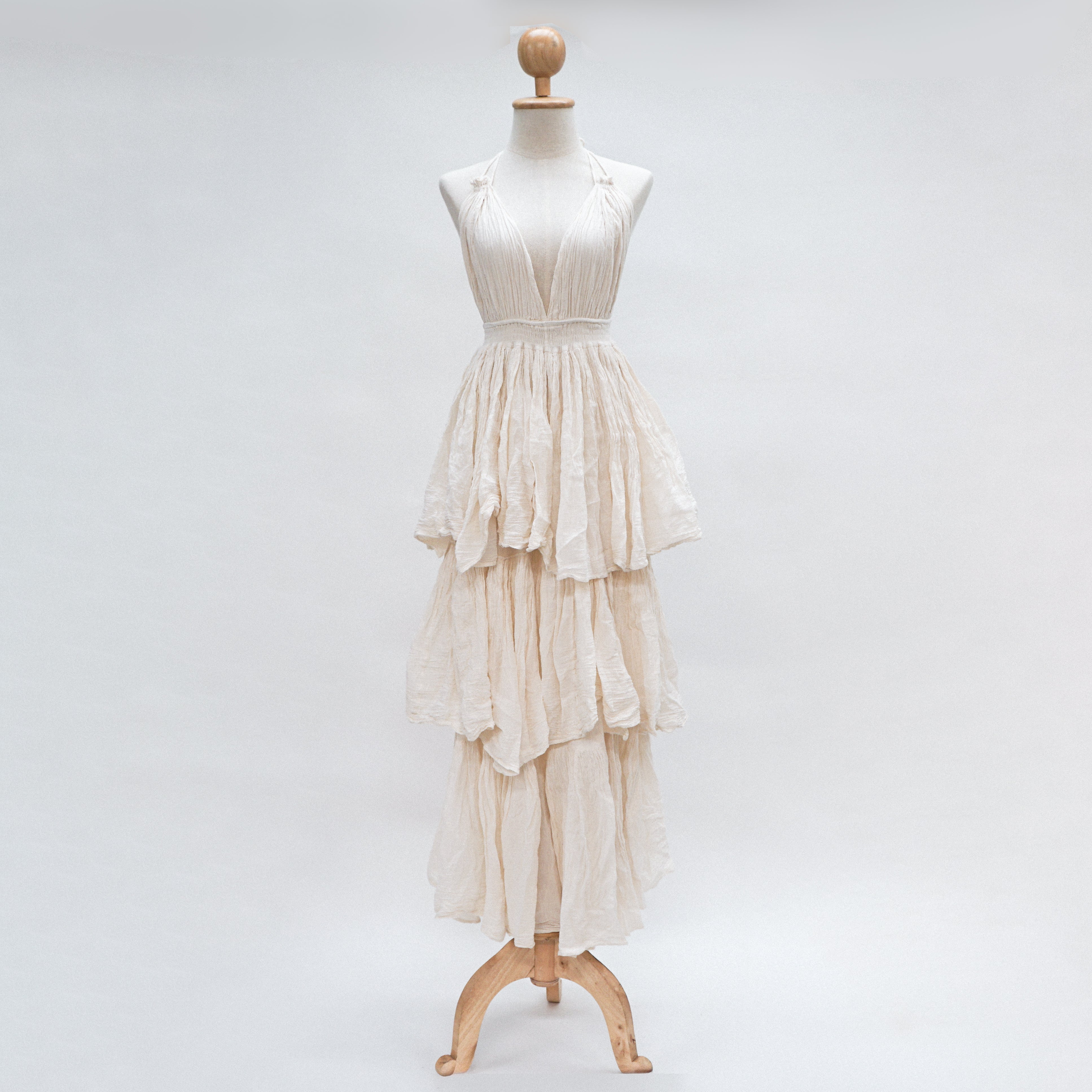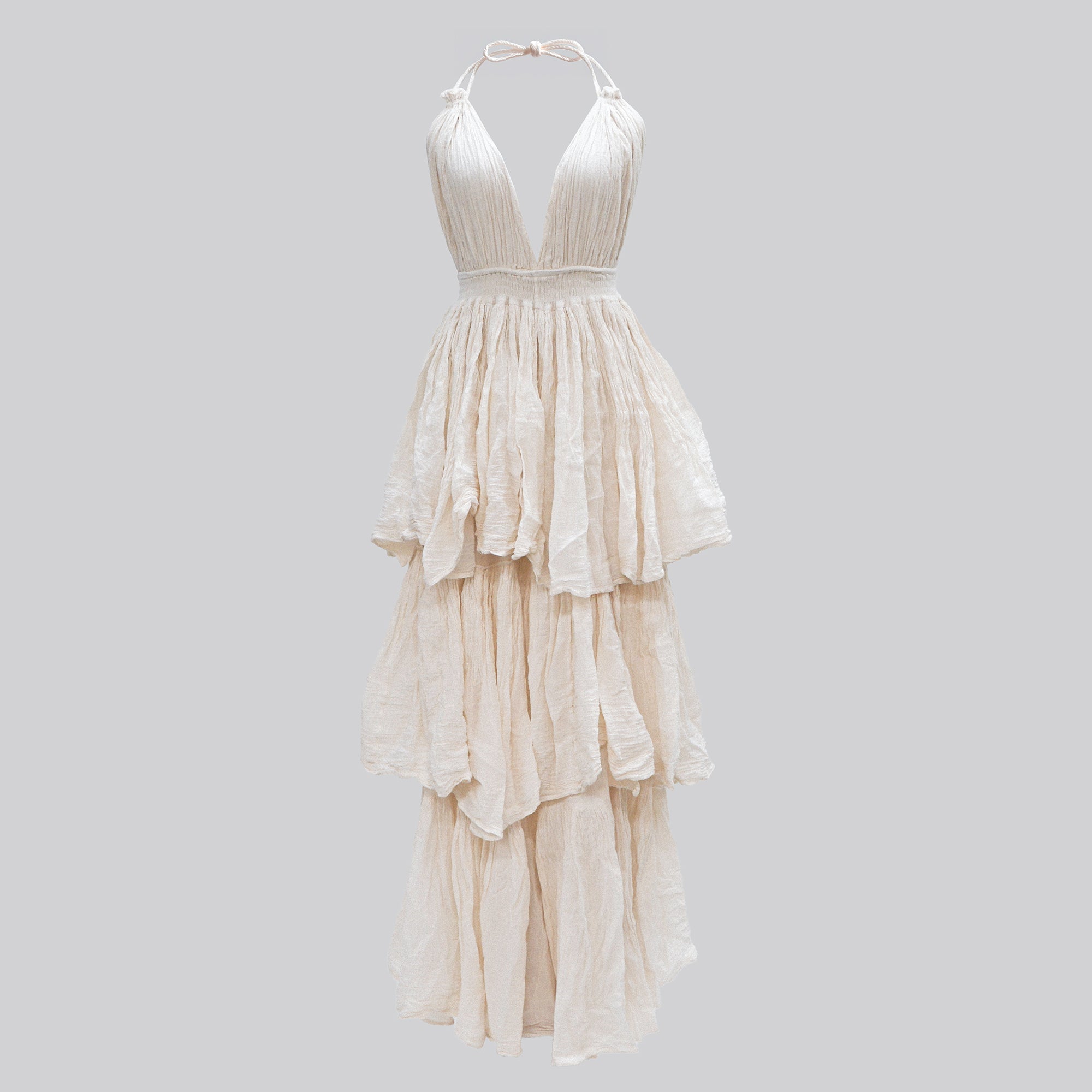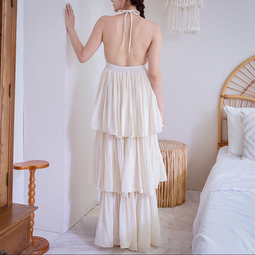Dive into summer elegance with this stunning maxi dress, featuring a flattering halter neckline that ties delicately at the back. Its deep V-neckline leads into a beautifully cinched waist, cascading down into multiple tiers of lightweight, subtly crinkled off-white fabric. Designed for graceful movement and ethereal charm, this dress is perfect for sun-drenched days and enchanting evenings.