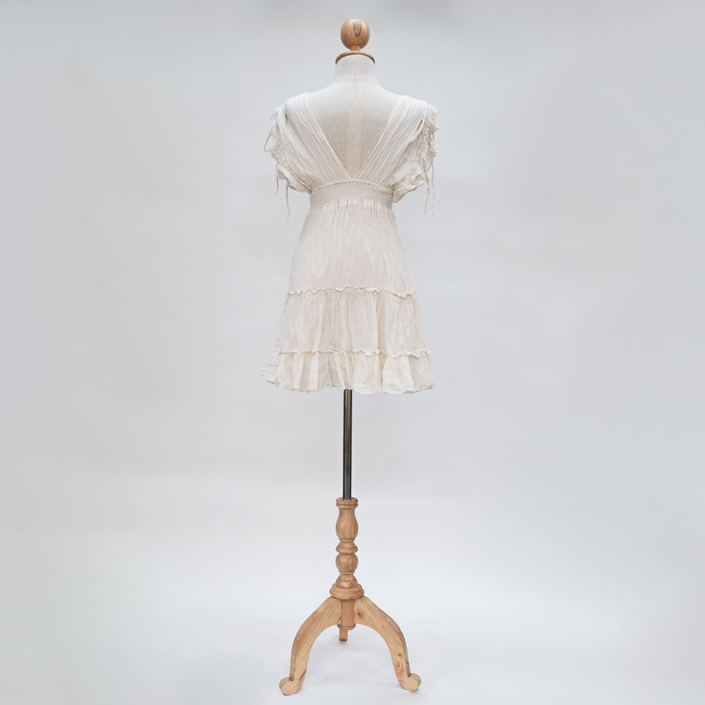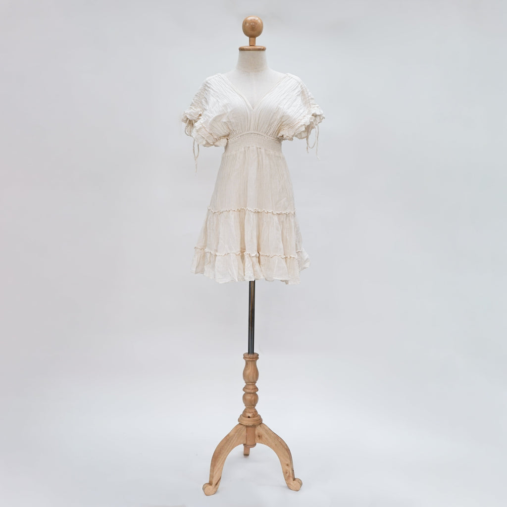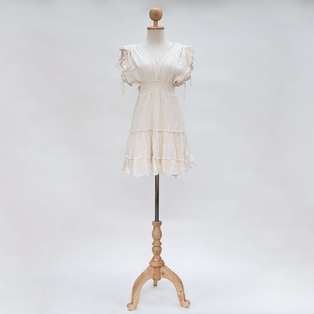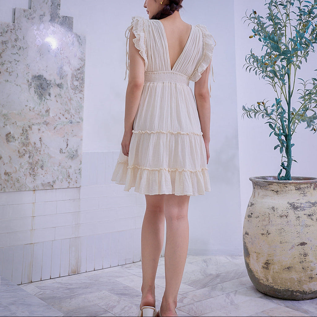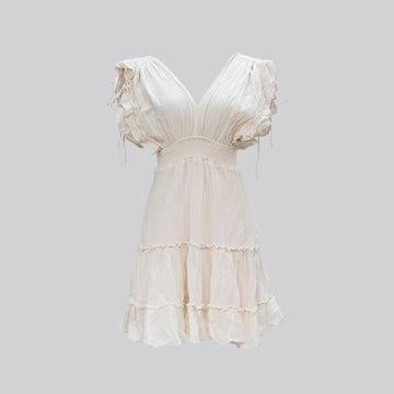 Designed for comfort and feminine allure, this beautiful short dress features a gracefully gathered V-neck bodice and a defined, elasticated waist for a flattering fit. The short, airy sleeves are adorned with charming ruffles and adjustable ties, while the skirt cascades in soft, tiered layers. Made from a light, textured off-white fabric, it's an ideal piece for whimsical summer days.