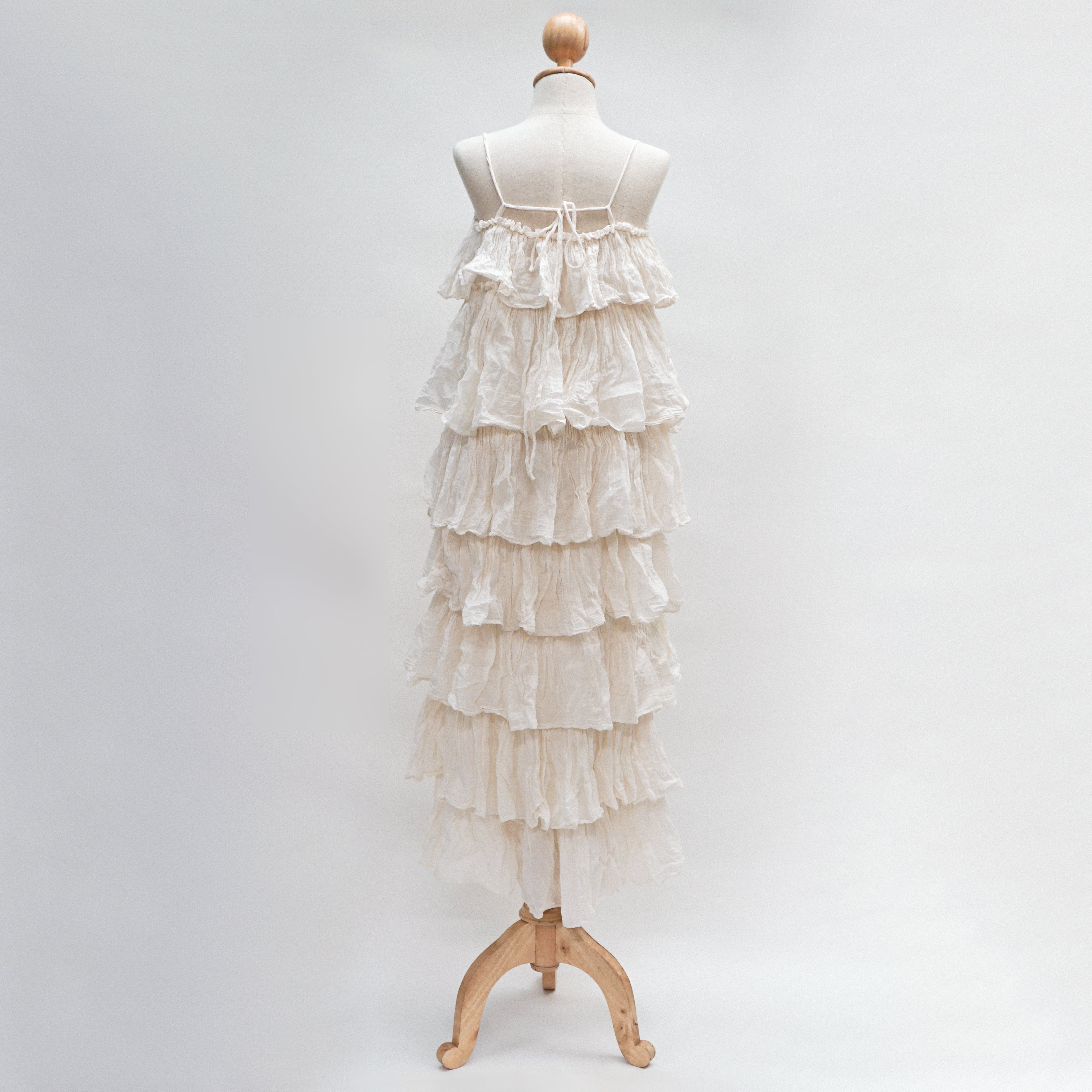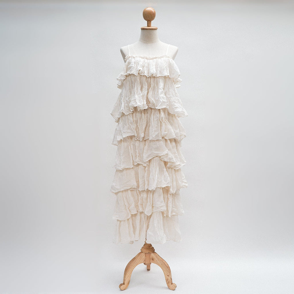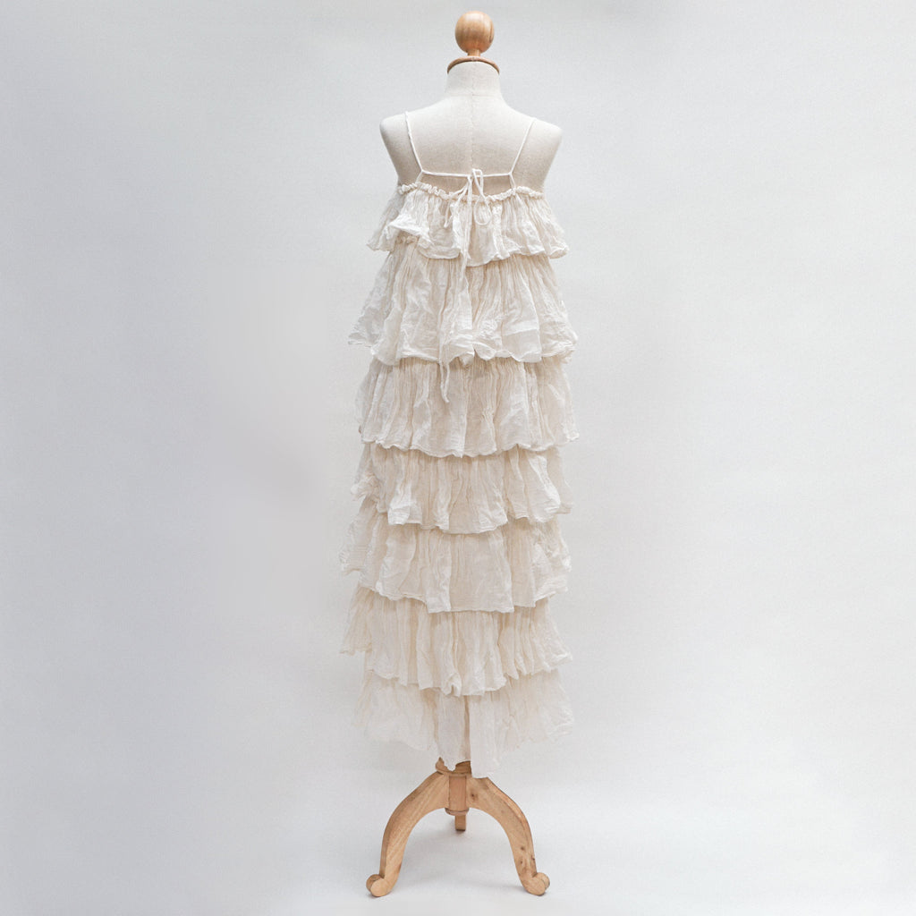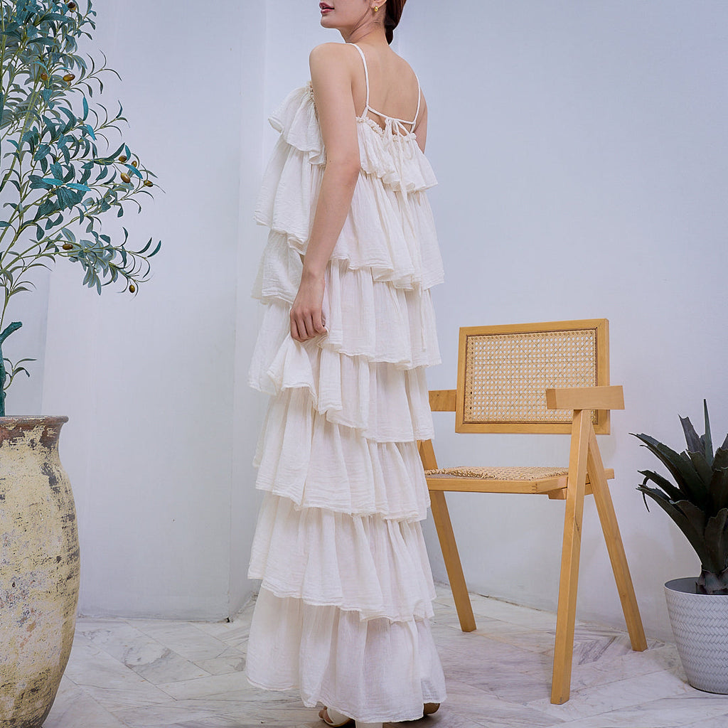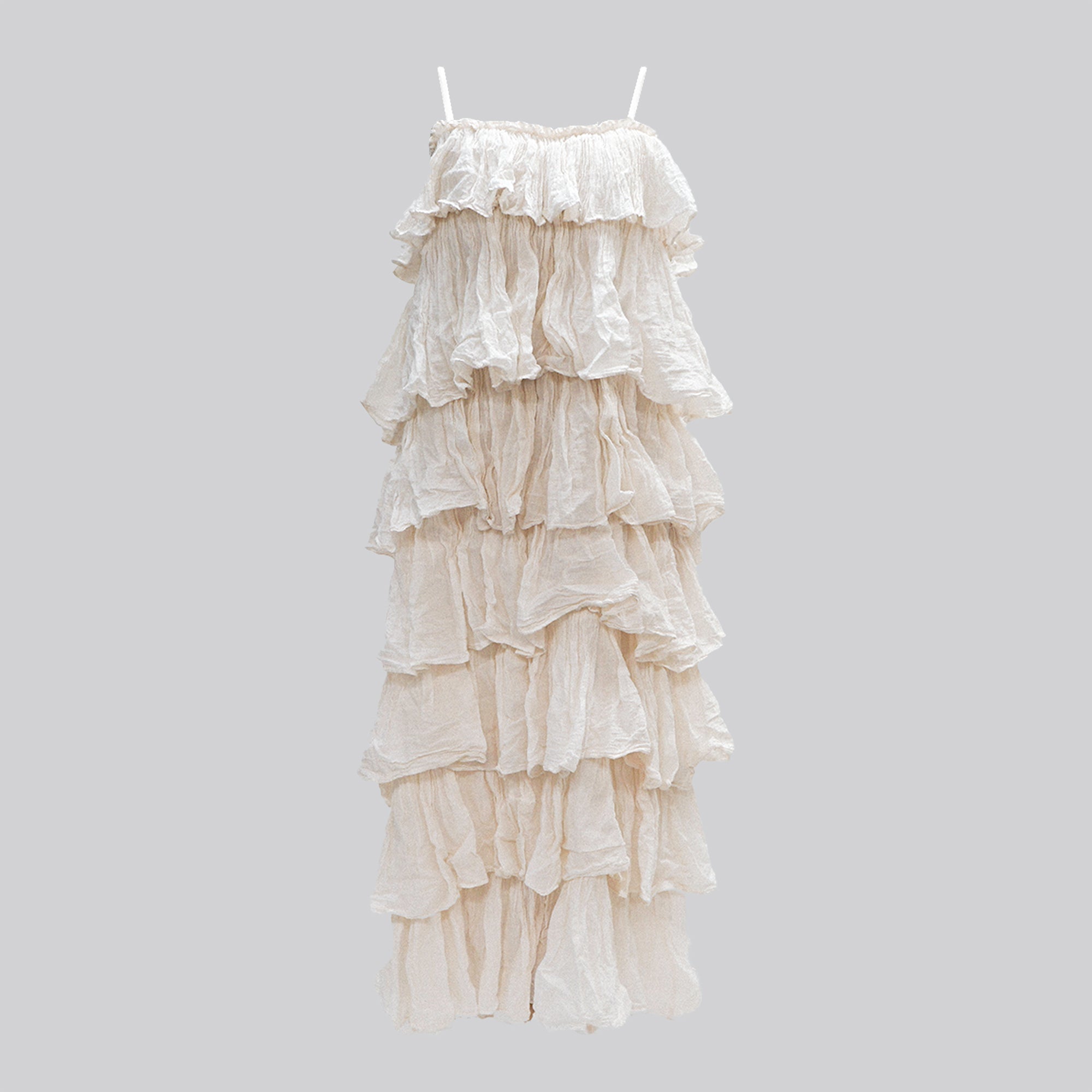 This Embrace whimsical charm with this beautiful maxi dress, featuring a cascading design of delicate ruffles from bust to hem. Crafted from a lightweight, subtly crinkled off-white fabric, its relaxed silhouette and adjustable spaghetti straps offer comfort and ethereal elegance perfect for warm days and enchanted evenings.